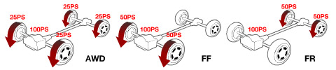 FF(前置發(fā)動機、前輪驅(qū)動)及FR(前置發(fā)動機、后輪驅(qū)動)等2WD(Two Wheel Drive:2輪驅(qū)動)車型只使用4個車輪中的2個進行驅(qū)動。即假如動力為100馬力的2WD車,一個驅(qū)動輪要承受50馬力的動力。由于路面狀況不同,有時動力會超出驅(qū)動輪的抓地力而出現(xiàn)車輪打滑現(xiàn)象。