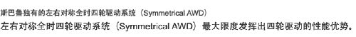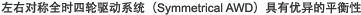一般來說,四輪驅(qū)動(dòng)方式的結(jié)構(gòu)易趨于復(fù)雜,而左右對(duì)稱全時(shí)四輪驅(qū)動(dòng)系統(tǒng)(Symmetrical AWD)的簡(jiǎn)潔緊湊在平衡方面具有很大的優(yōu)勢(shì)