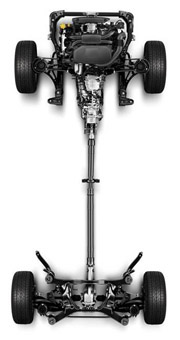 將從發(fā)動(dòng)機(jī)到后差速器的驅(qū)動(dòng)系統(tǒng)進(jìn)行左右對(duì)稱并呈直線配置,這是由縱置水平對(duì)置發(fā)動(dòng)機(jī)(SUBARU BOXER)所決定的。這使車輛重心處于左右對(duì)稱的中心位置,因此,無論在何種行駛狀態(tài)下,運(yùn)動(dòng)平衡都能帶來高度的主動(dòng)安全性。