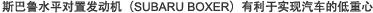 斯巴魯水平對(duì)置發(fā)動(dòng)機(jī)(SUBARU BOXER)與普通的其他類型發(fā)動(dòng)機(jī)相比,總長度較低,而且重量輕、結(jié)構(gòu)緊湊。在降低車輛重心、提升主動(dòng)安全性(保持行駛、轉(zhuǎn)彎、制動(dòng)時(shí)的穩(wěn)定性)方面極具優(yōu)勢(shì)。