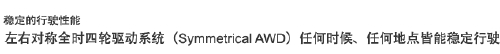 左右對(duì)稱(chēng)全時(shí)四輪驅(qū)動(dòng)系統(tǒng)(Symmetrical AWD) 四輪平衡抓地,山頂彎道處亦能輕松駕乘。
